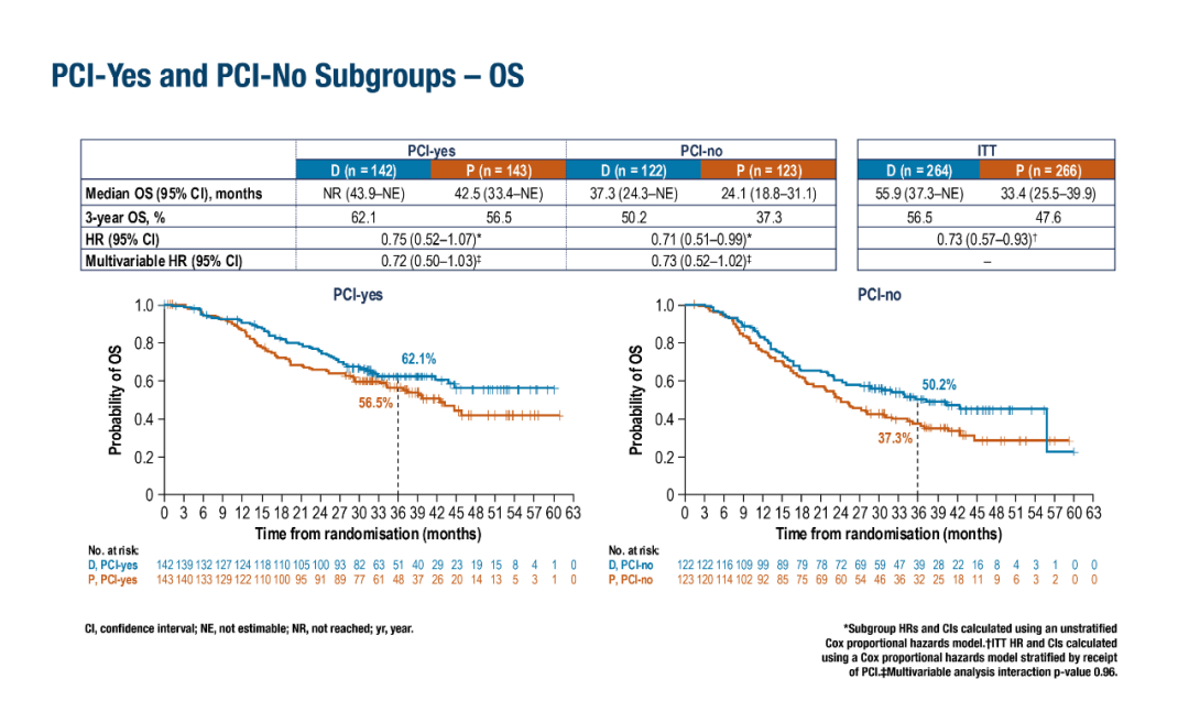 图1无论是否进行PCI,与安慰剂组相比,度伐利尤单抗组的中位OS和3年OS更长(ESMO Congress 2024,LBA81)
