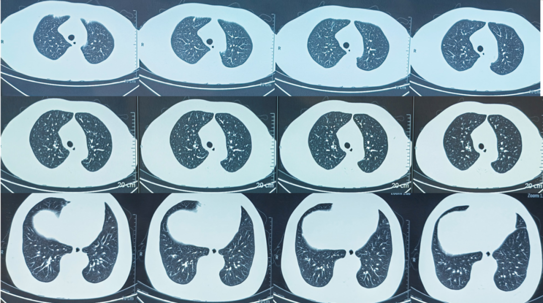 图6.复查胸部CT(2024-09-19):胸廓对称,肋骨走行连续;双肺可见散在小斑片状、小条片状及结节状密度增高影,边界清。双肺可见少量纤维条索影,边界清。双肺可见多发结节灶,较大位于左肺上叶前段(IM12),大小约12mmx6mm。诊断:1.双肺多发结节灶;双肺索条、慢性炎症,较有所好转;2.胸9椎体变扁并密度不均,转移瘤并病理性骨折