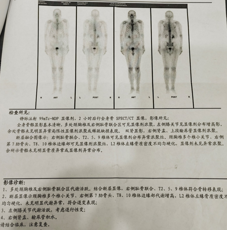 骨扫描(2024-04-18):T9、L2、右耻骨见局限性异常放射性浓聚影,考虑转移性病变。