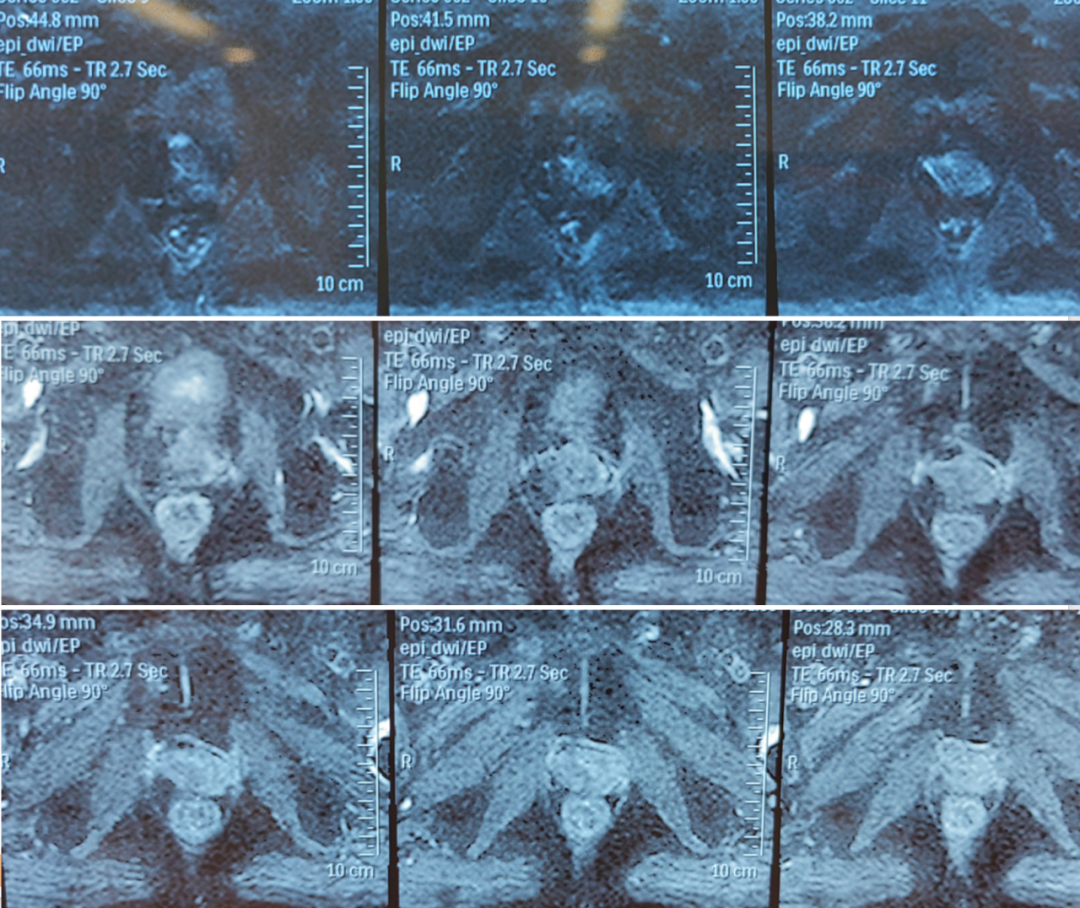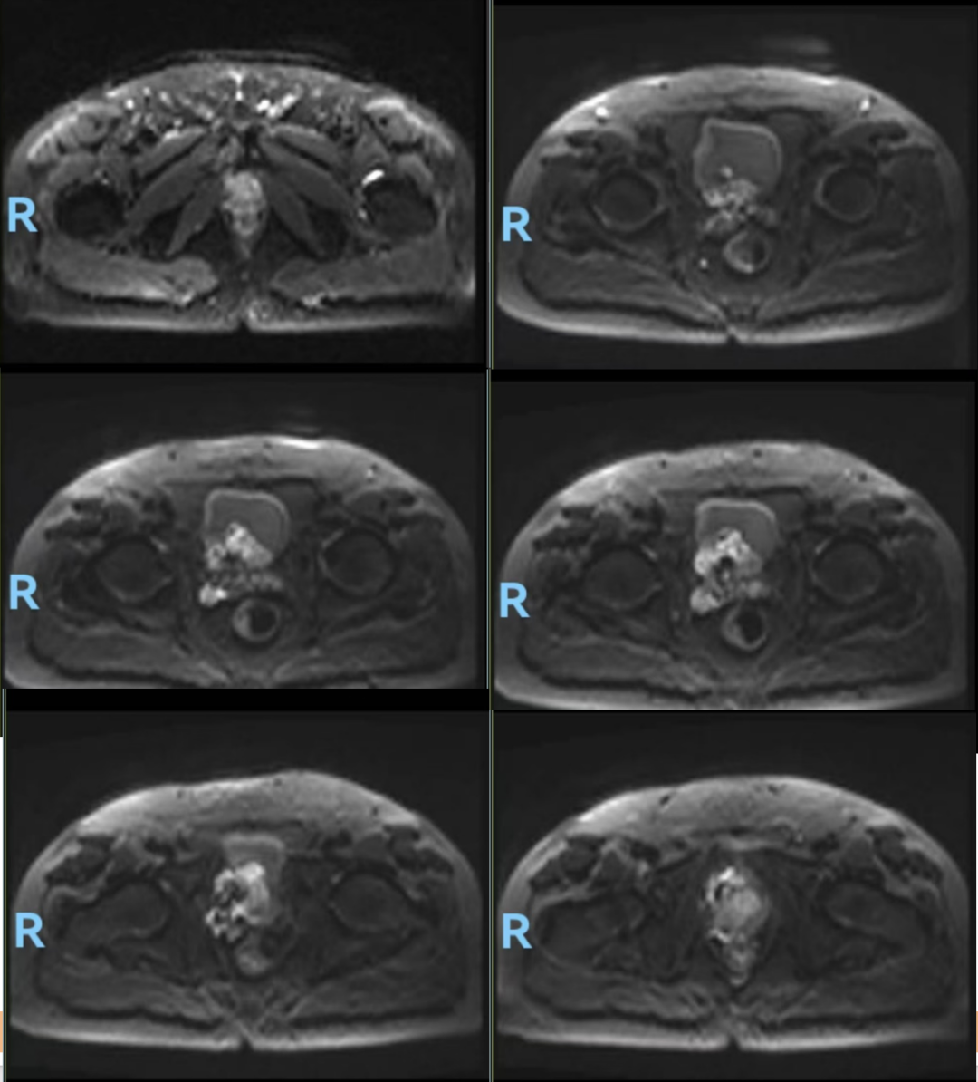 图1.前列腺MR(2024-04-18):前列腺体积不规则增大,约6.2cm(左右)x5.4cm(前后)x7.1cm(上下),中央带、外周带可见不规则片状短T2等T1信号灶,病灶向上突向膀胱,与膀胱后壁及精囊腺分界不清,DWI示病变呈弥散受限高信号,相应ADC信号减低。盆腔内见多个小淋巴结,较大者短径约为0.6cm。双侧耻骨及第1骶骨见稍长T1长T2信号,DWI弥散受限改变。直肠右侧壁局部增厚。诊断:1、考虑前列腺癌,PI-RADS 5,膀胱后壁、双侧精囊腺浸润;2、双侧耻骨及第1骶骨异常信号,转移瘤可能