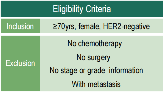 本研究纳入2010年至2015年间美国国立癌症研究所的监测、流行病学和最终结果(SEER)数据库中记录的70岁及以上HER2阴性乳腺癌患者队列,研究新辅助治疗和辅助治疗与总生存期(OS)的相关性,以确定该人群中新辅助治疗在预后方面的优势。