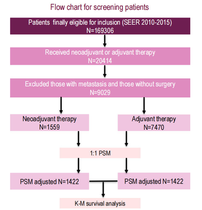 我们从SEER数据库中分析了169306例70岁及以上的HER2阴性乳腺癌患者。其中,20414例患者接受了新辅助治疗或辅助治疗。在排除远处转移和未接受手术的患者后,剩余9029例患者:1559例接受了新辅助化疗,7470例接受了辅助化疗。基于多种因素计算倾向性评分,最终每组纳入1422例患者。