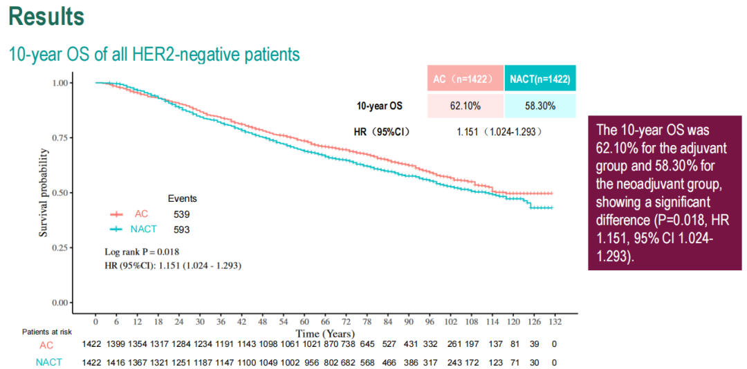 辅助化疗组的10年OS率为62.10%,而新辅助化疗组为58.30%,两组之间存在显著差异(HR=1.151,95%CI:1.024~1.293,P=0.018)。