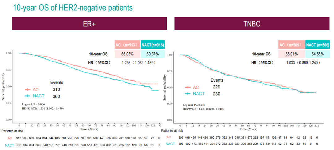 对于雌激素受体阳性(ER+)患者,与接受新辅助化疗相比,接受辅助化疗的10年OS显著提高(66.05%vs.60.37%,HR=1.236,95%CI:1.062~1.439,P=0.006)。在三阴性乳腺癌(TNBC)患者中,新辅助化疗与辅助化疗相比,并未提高10年OS(54.55%vs.55.01%,HR=1.033,95%CI:0.860~1.240,P=0.730)。