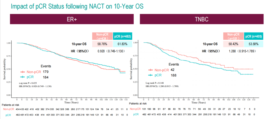 对于ER或TNBC患者,与新辅助治疗后未达到pCR的患者相比,达到pCR并未显著改善10年OS(ER+:61.83%vs.58.76%,HR=0.920,P=0.425;TNBC:53.58%vs.58.42%,HR=1.280,P=0.148)。