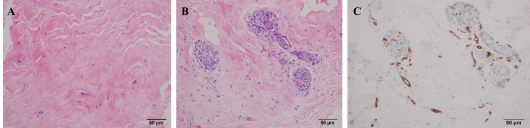 术后结果显示,植入物在术后的不同时间均能够维持自然且与对侧对称的乳腺外形。所有患者的乳头和乳晕区域均未出现皮瓣坏死或缺血情况;无患者报告功能性肢体功能障碍。术后1个月,12位患者有肿胀、疼痛或异物感,三个月后症状消失。术后1年组织学分析显示,支架内部及周围存在纤维结缔组织、成纤维细胞和血管。伴随着支架内的自体组织再生,3D打印支架在体内逐渐降解,平均降解率在12个月时为54.07%,24个月时为74.48%,36个月时为86.94%,48个月时为87.36%,60个月时为92.76%。