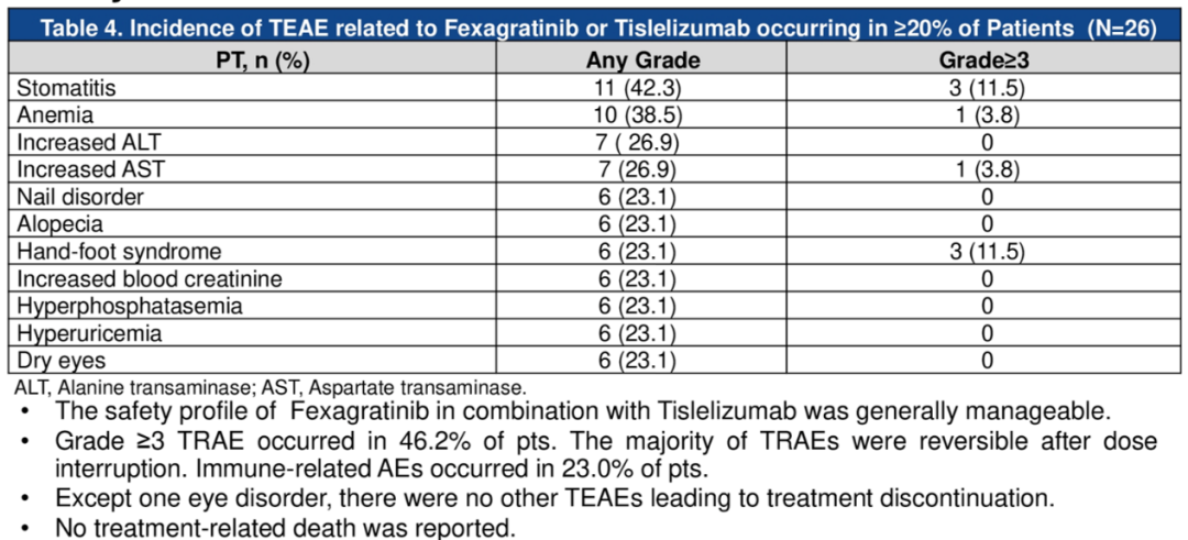 Fexagratinib与替雷利珠单抗联合治疗的安全性总体可控。46.2%的患者出现了3级及以上的治疗相关不良事件(TRAEs),大多数TRAEs在中断治疗后消失。23.0%的患者出现免疫相关不良事件。除一例眼部疾病外,没有其他TRAEs导致治疗中断,且无治疗相关死亡病例报道。