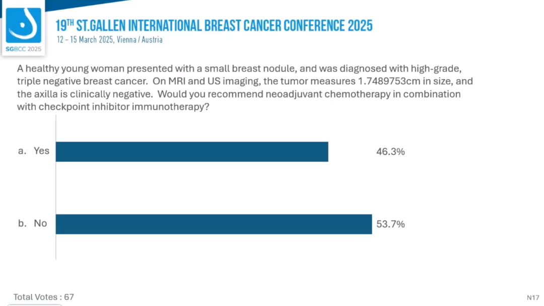 (2)一名健康年轻女性因发现乳腺小结节就诊,确诊为高级别三阴性乳腺癌。MRI与超声显示肿瘤大小为1.7489753 cm,腋窝临床阴性。您是否会推荐新辅助化疗联合检查点抑制剂免疫治疗?