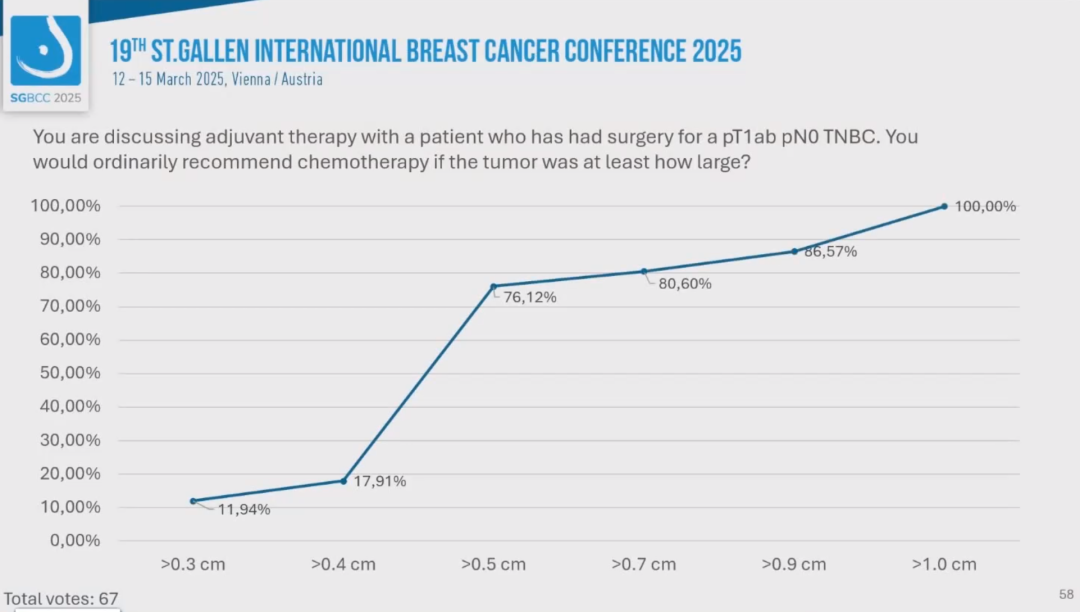 (3)在与一位pT1ab pN0三阴性乳腺癌术后患者讨论辅助治疗时,通常当肿瘤达到多大尺寸会建议化疗?