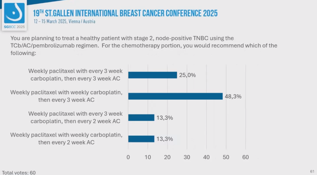 (6)您计划使用TCb/AC/帕博利珠单抗方案治疗状态较好的淋巴结阳性II期TNBC患者。对于化疗部分,您会推荐: