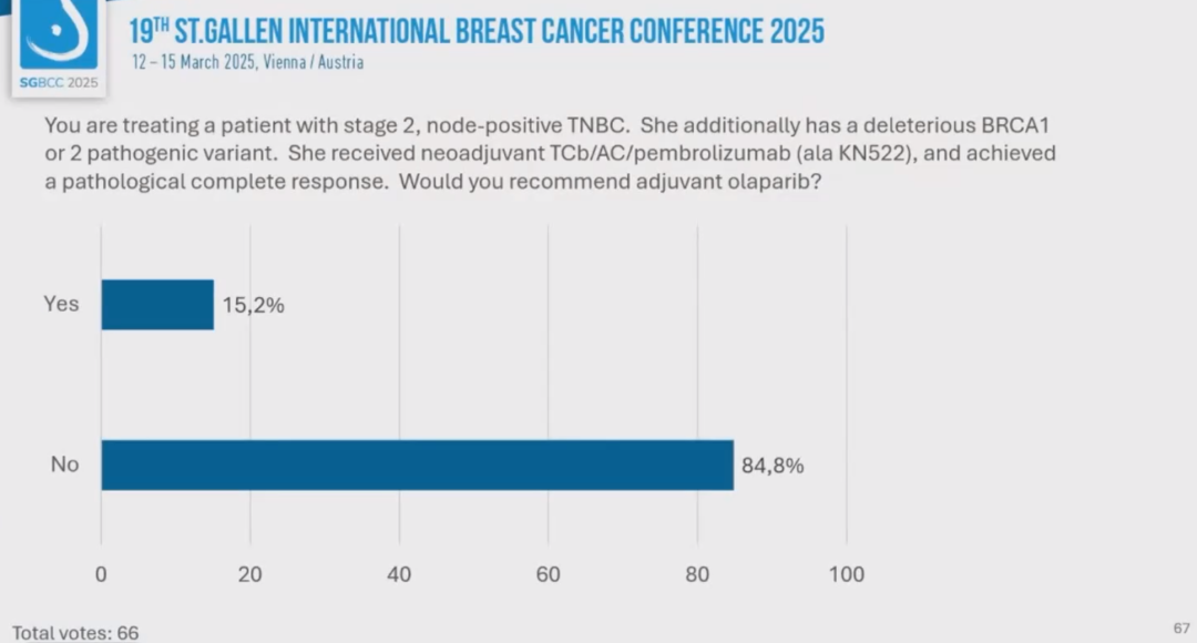 (12)您正在治疗携带BRCA1/2致病变异的II期淋巴结阳性TNBC患者。患者接受TCb/AC/帕博利珠单抗新辅助治疗(参照KN522研究)后获得病理完全缓解。您会推荐奥拉帕利辅助治疗吗?