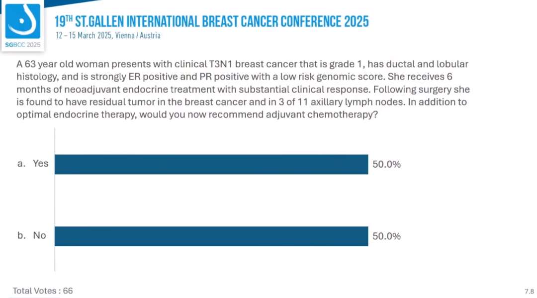 (8)一名63岁女性临床分期为T3N1乳腺癌,组织学分级1级,导管及小叶混合型,ER和PR强阳性且基因组评分低风险。接受6个月新辅助内分泌治疗后临床显著缓解。术后发现乳房残留肿瘤及11枚腋窝淋巴结中3枚阳性。除优化内分泌治疗外,是否建议辅助化疗?
