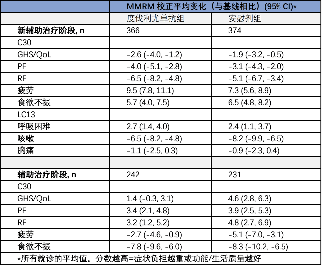 两组的问卷完成率在所有访视中均保持较高水平(>79%)。两组间的新辅助和辅助治疗基线PRO评分均值基本均衡。在新辅助或辅助治疗期间,两组的PRO评分(所有访视的平均值)与基线相比均未观察到具有临床意义的MMRM校正平均变化(见表)。根据PRO-CTCAE(探索性终点)评估,两组报告治疗相关症状的患者比例无明显差异,但新辅助治疗期间度伐利尤单抗组报告皮疹的患者比例高于安慰剂组(数据待呈现)。