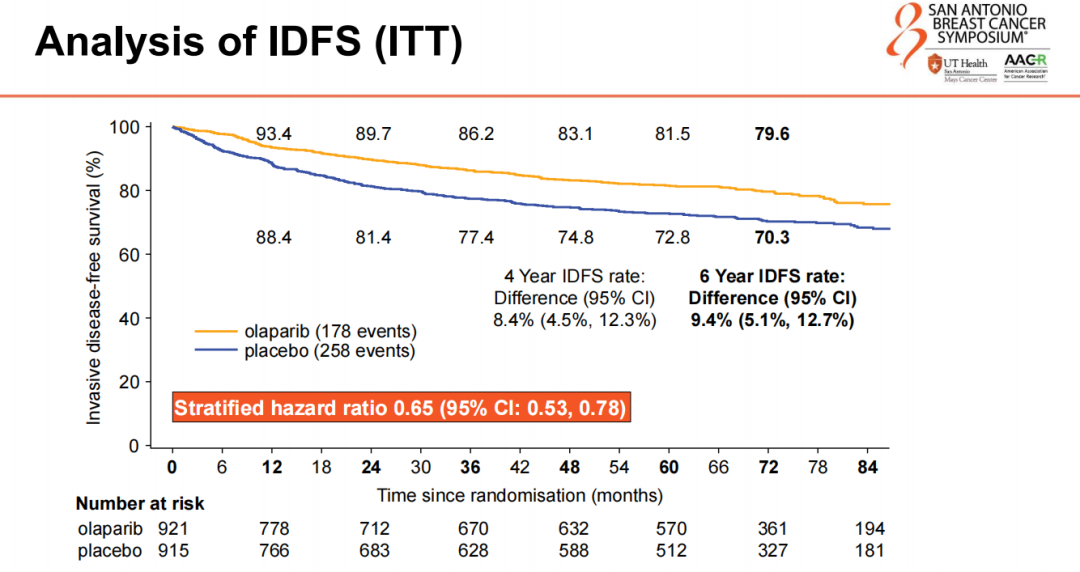 首先,OlympiA研究为这类患者提供了非常好的强化治疗策略,随访6年结果显示,奥拉帕利组较安慰剂组在6年iDFS率上有9.4%的显著提升,这强有力的支持了PARP抑制剂的使用。同时,monarchE研究和NATALEE研究也给出了CDK4/6抑制剂的强化治疗策略,其iDFS获益绝对数值在3~5%,虽然相较于OlympiA研究的获益数值略小,但同样具有统计学意义,且在辅助治疗中已达到了较好的获益。