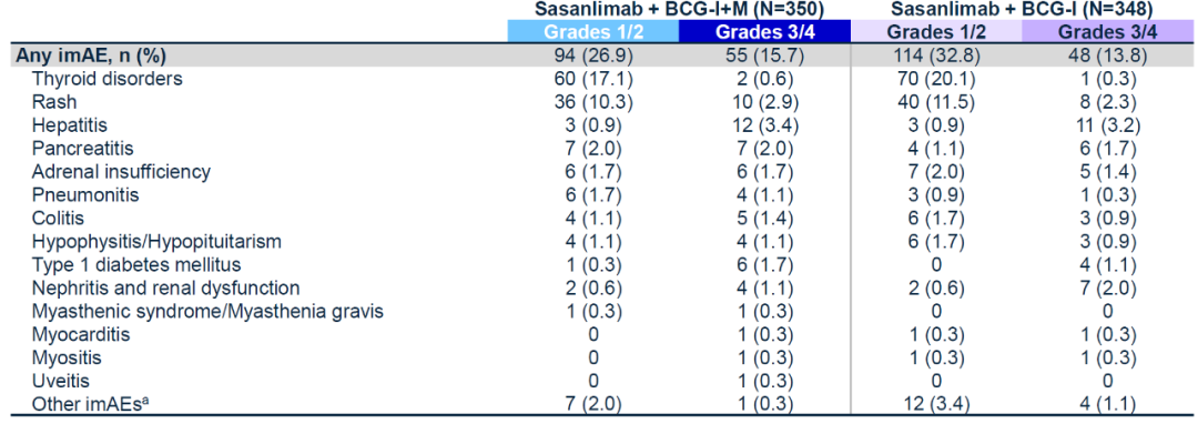 最后,在安全性方面,Sasanlimab联合BCG诱导+维持治疗安全性良好,没有出现新的安全性信号,且对比单用BCG诱导+维持治疗不会显著提升患者的不良反应发生率。总体AE发生率为58.0%vs 63.9%,3级以上AE发生率为29.1%vs 6.3%,其中最常见的不良反应为甲状腺功能异常、皮疹、肝炎、胰腺炎等。