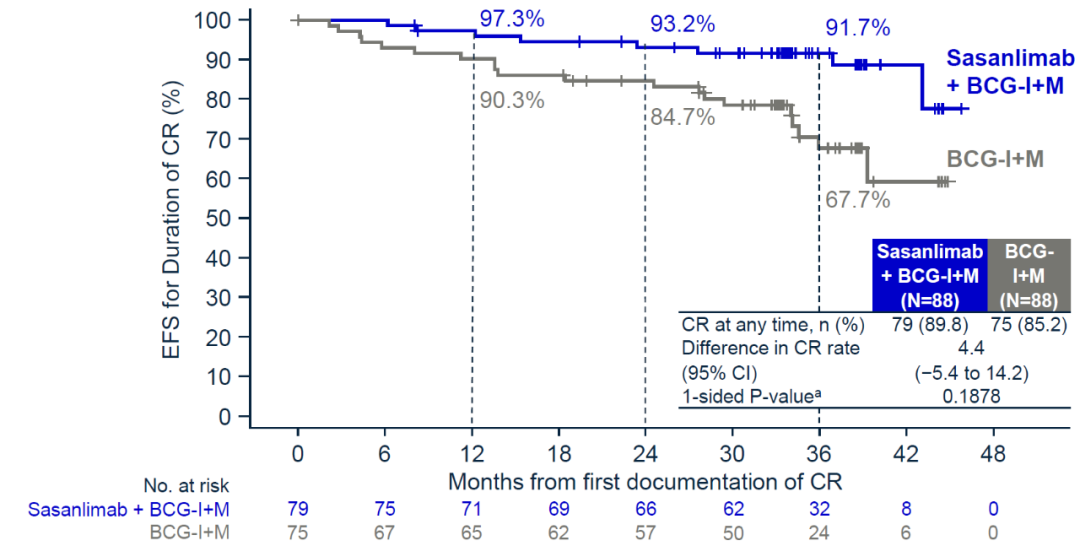 此外,研究结果显示,在CIS患者中,接受Sasanlimab联合BCG诱导+维持的患者有更长的持续完全缓解时间,在随访36个月时,联合组的CR率仍然高达91.7%,而但用BCG诱导+维持组的这一比率仅为67.7%。