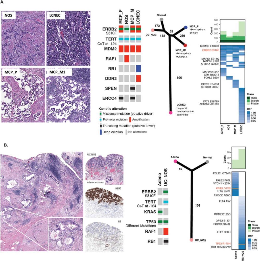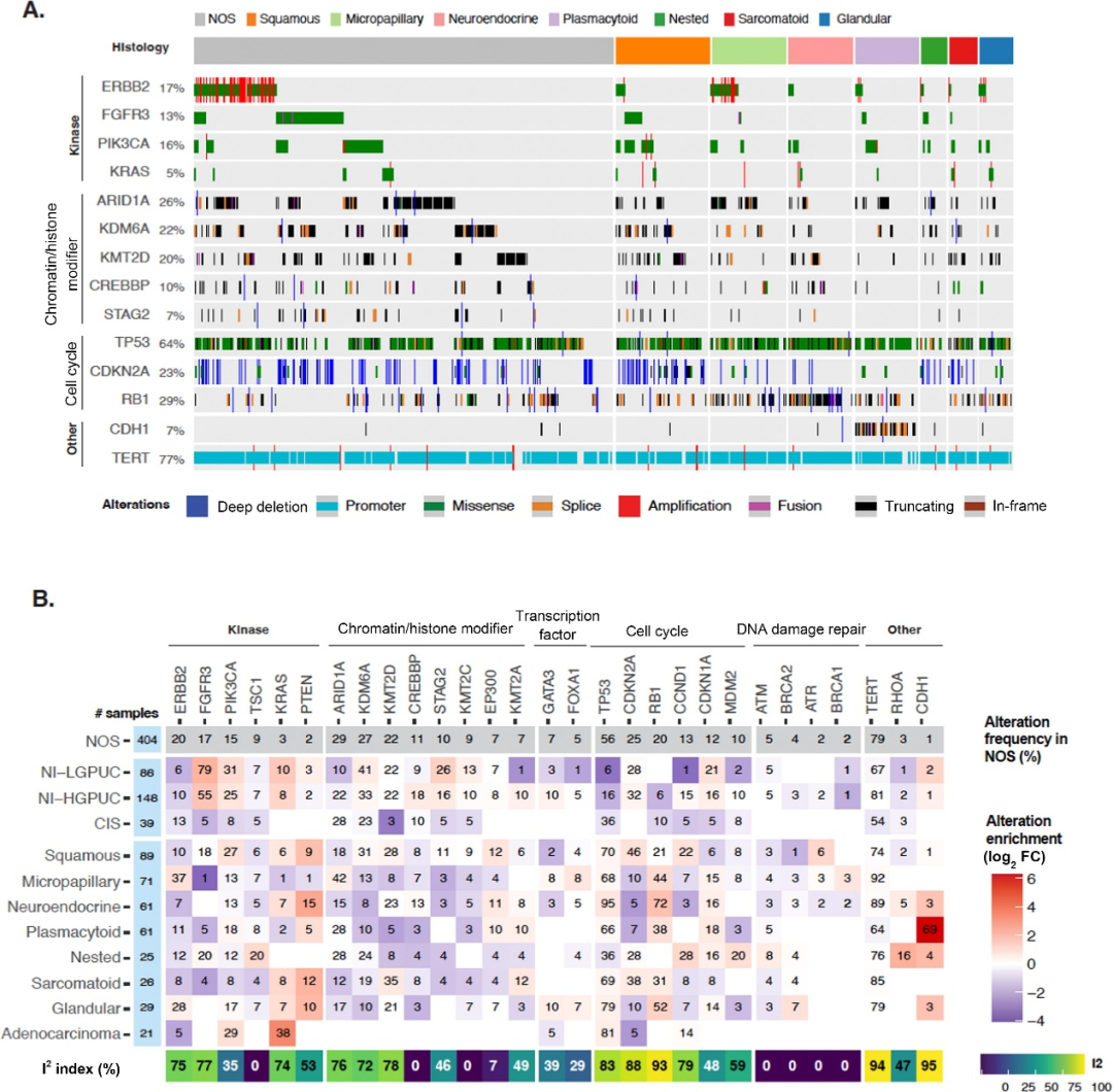 研究者发现,TP53(95%)和RB1(75%)变异偏向小细胞/神经内分泌性UC,CDH1变异(70%)偏向浆细胞样UC,CDK2NA变异(46%)偏向鳞状UC,ERBB2变异(35%)偏向微乳头状UC,MDM2变异(20%)偏向巢状亚型。