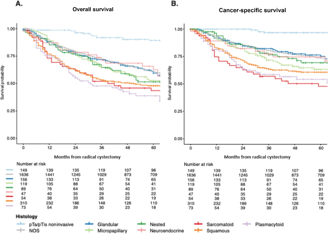 非侵袭性病变(pTa/pTis)患者的疾病特异性死亡(DSD)的累积发生率在第2年(0.0%)、第5年(2.3%)较低。不同组织学亚型的5年DSD累积发生率存在显著差异:微乳头状UC(35%)、浆细胞样UC(42%)、肉瘤样UC(51%)和鳞状UC(35%)的发病率较高;而无异常组织学UC(NOS)(24%)、巢状UC(29%)、小细胞/神经内分泌UC(25%)和腺样UC(22%)的发病率较低。多变量模型分析显示,在调整病理分期后,肉瘤样UC(HR 1.76)、浆细胞样UC(HR 1.51)、微乳头状UC(HR 1.43)和混合型(HR 1.42)均与膀胱癌特异性死亡风险显著相关。