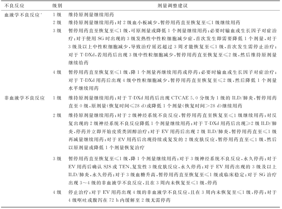对于ADC药物应用过程中可能的不良反应,治疗前应给予积极评估;用药后应密切监测相关不良反应,及时诊断并给予对应处置方案,同时重新评估药物治疗方案,必要时进行延期治疗或减量处理;对于严重不良反应要及时停药,积极开展MDT会诊,探讨解决方案。