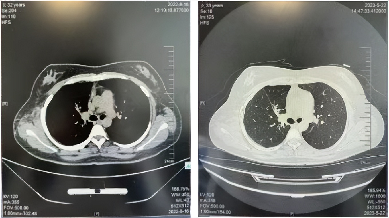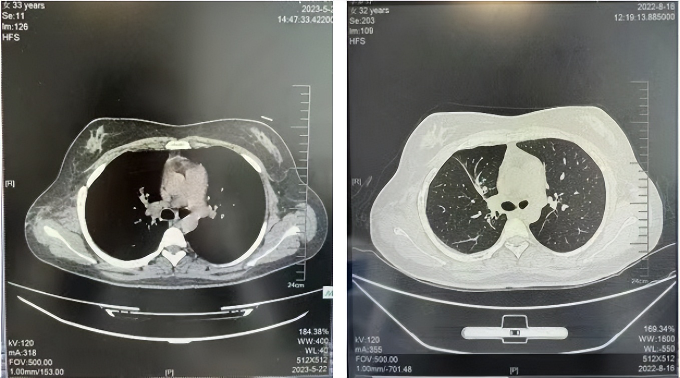 诊疗经过:2022年5月始口服克唑替尼3个月,出现肝功能异常(DILI 2级伴临床症状),改用恩沙替尼靶向治疗至今,目前评效为维持PR。恩沙替尼应用期间出现轻度肝功能异常(DILI 1级),对症处理后好转。截止目前PFS 33个月。