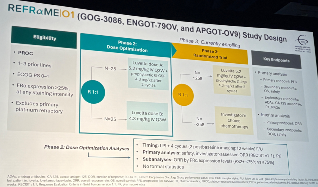 II/III期REFRαME-O1临床试验(NCT05870748)的II期临床试验数据已于2025年妇科肿瘤学会(Society of Gynecologic Oncol)女性癌症年会上公布。入选II期研究的患者按1:1的比例随机分配接受以下两组治疗:每3周一次,前2个周期起始剂量为5.2mg/kg,联合预防性粒细胞集落刺激因子(G-CSF)治疗,之后治疗周期的剂量为4.3mg/kg;或从第1个周期开始每3周接受一次4.3mg/kg剂量治疗。入选患者需既往接受过1-3线治疗,且ECOG体能状态评分为0或1。原发性铂类难治性疾病患者被排除在外。II期研究的主要终点是安全性、研究者根据RECIST 1.1标准评估的客观缓解率(ORR)以及药代动力学。