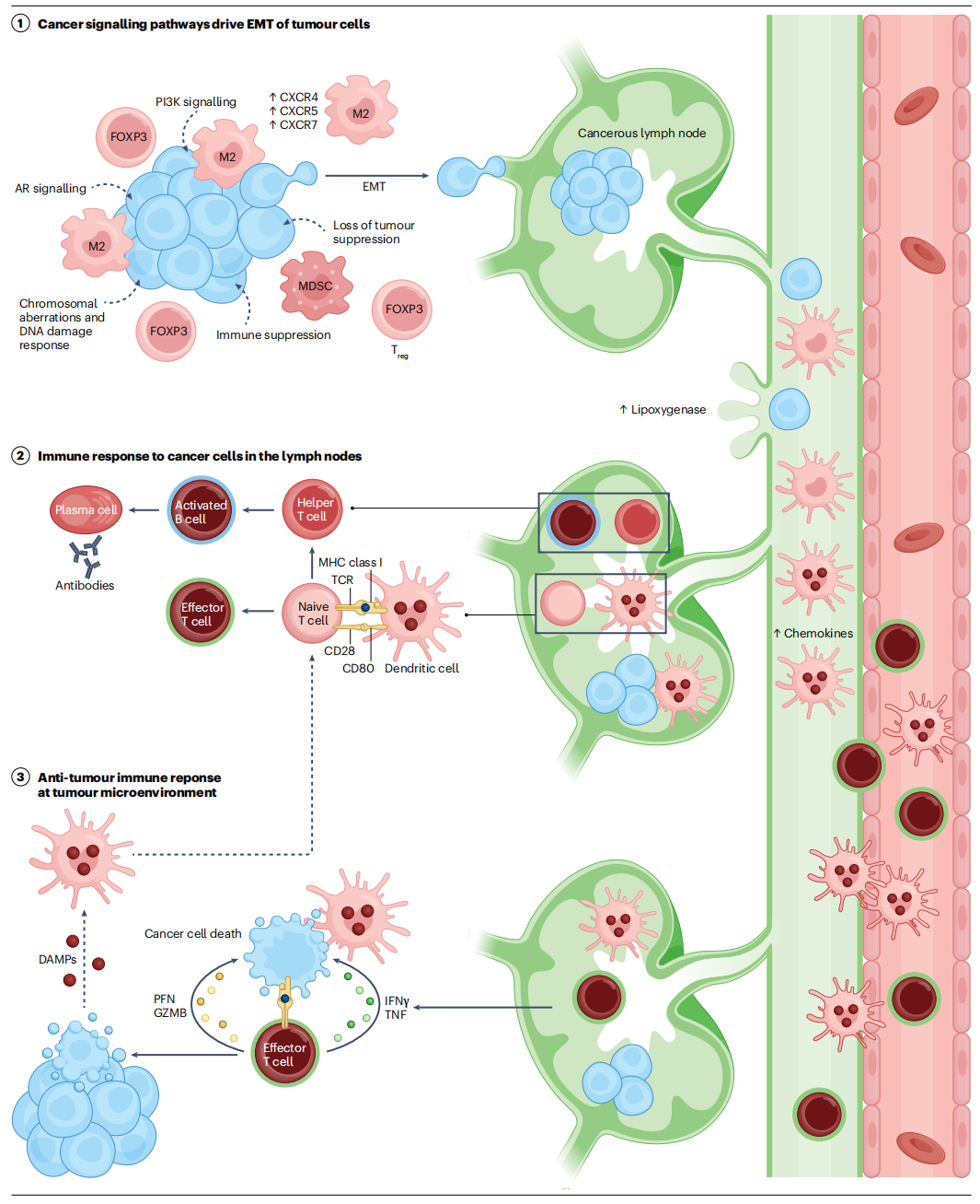 图1.淋巴系统在促进癌细胞扩散中的作用。癌细胞通过上皮-间质转化(EMT)进入淋巴系统,逃避免疫系统。这一过程涉及癌症信号通路的异常,如PI3K和AR信号,肿瘤抑制因子的丧失,以及细胞因子和趋化因子的上调。癌细胞还通过肿瘤微环境中的免疫抑制细胞(如Treg细胞、MDSCs、M2巨噬细胞)来克服免疫检查点,建立免疫抑制状态。这些细胞帮助癌细胞从肿瘤环境扩散到淋巴结。进入淋巴系统后,癌细胞通过上调酶(如脂氧合酶)破坏淋巴管,促进肿瘤细胞向淋巴结的扩散。淋巴系统内的免疫细胞(如APCs)识别并呈递抗原给T细胞,激活免疫反应。初始T细胞在APC激活下分化为CD8+效应T细胞或CD4+辅助T细胞,参与肿瘤细胞的杀伤。激活的免疫细胞通过淋巴系统迁移到血液中,进入肿瘤微环境,杀死肿瘤细胞并释放抗原,再次激活T细胞,建立抗肿瘤免疫。(图源:参考文献[1])