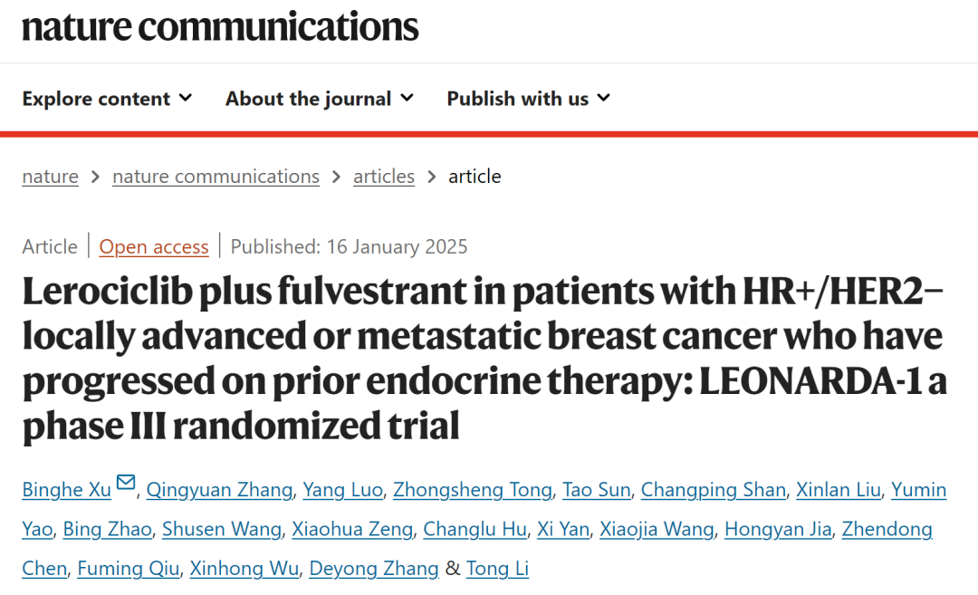 4、Xu,Binghe et al.“Lerociclib plus fulvestrant in patients with HR+/HER2-locally advanced or metastatic breast cancer who have progressed on prior endocrine therapy:LEONARDA-1 a phase III randomized trial.”Nature communications vol.16,1 716.16 Jan.2025,doi:10.1038/s41467-025-56096-2