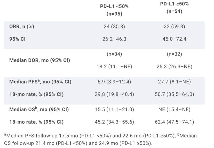 本研究共纳入149例KRAS G12C突变的晚期/转移性NSCLC患者,所有患者均为一线治疗,PD-L1表达比例不限。患者接受Adagrasib(400mg,口服,每日两次)联合帕博利珠单(200mg,静脉注射,每3周一次)。主要终点为研究者评估的ORR,次要终点包括DoR、PFS、OS及安全性。