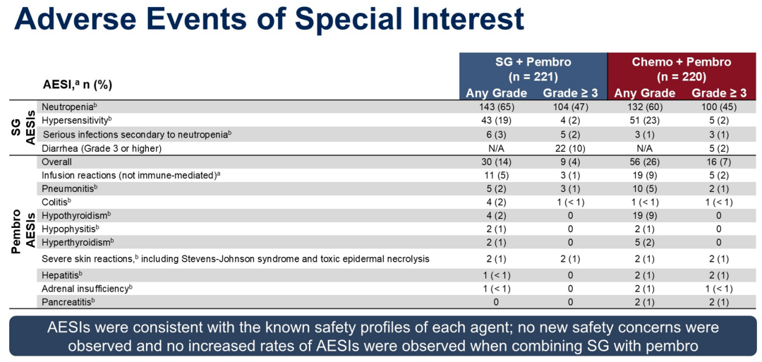 我们较为关心的另一个问题是ADC联合免疫是否增加毒副作用。从ASCENT-04研究来看,两组的≥3级治疗期间不良事件(TEAE)发生率一致(71%vs 70%),而且SG组的停药率仅为化疗组的三分之一(12%vs 31%),显示了更好的治疗耐受性。此外,针对临床所关注的ADC或免疫治疗相关的特殊不良事件,该研究均观察到与化疗组相当水平的发生率,且没有增加新的安全性事件。