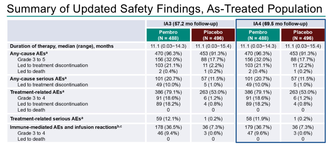 共994例患者被随机分配接受帕博利珠单抗(n=496)或安慰剂(n=98)治疗。截至2024年9月25日的数据截止日期,中位随访时间为69.5个月。所有患者在3年前完成了或停止了研究治疗。帕博利珠单抗组和安慰剂组分别发生了188例和241例DFS事件。中位DFS未达到(NR),而安慰剂组为68.3个月(HR 0.71,95%CI:0.59-0.86);5年时的估计DFS率分别为60.9%和52.2%。帕博利珠单抗组和安慰剂组分别发生了68例和99例OS事件。两组的中位OS均为NR(HR 0.66,95%CI:0.48-0.90);5年时的估计OS率分别为87.7%和82.3%。DFS和OS结果在包括预先规定的风险和肉瘤样特征在内的关键亚组中是一致的。在3年内没有报告新的严重治疗相关不良反应。