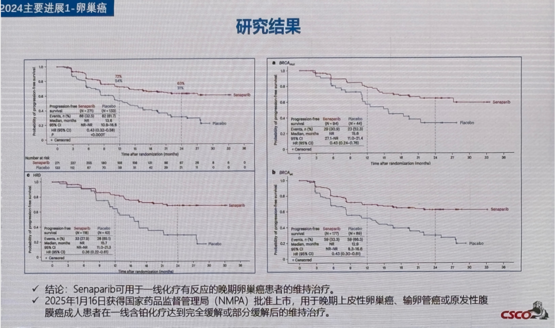 由此可见,对于一线含铂化疗有响应的晚期卵巢癌患者,无论BRCA或HRD状态,塞纳帕利维持治疗相比安慰剂显著改善PFS,且耐受性良好。基于此,2025年1月16日获得国家药品监督管理局(NMPA)批准上市,用于晚期上皮性卵巢癌、输卵管癌或原发性腹膜癌成人患者在一线含铂化疗达到CR/PR后的维持治疗。
