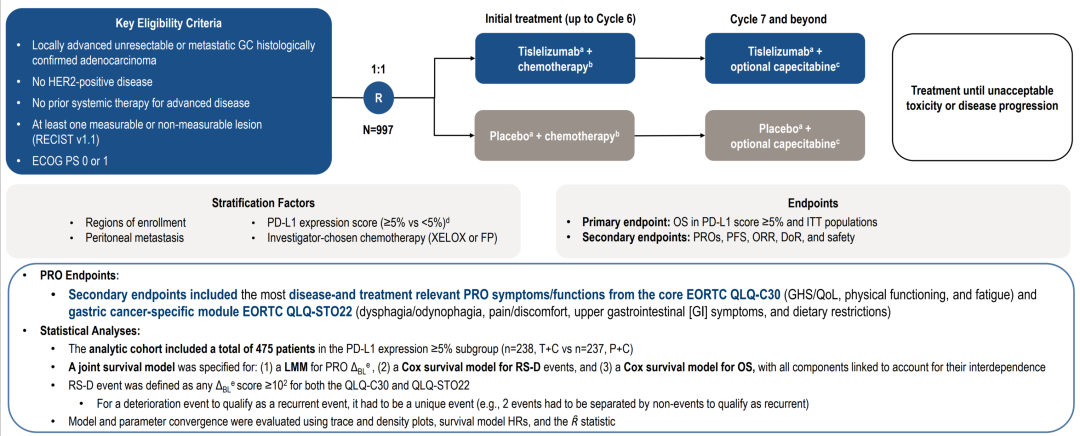 RATIONALE-305研究(NCT03777657)要求入组患者为:局部晚期不可切除或转移性胃腺癌、HER2阴性、既往未接受晚期疾病全身治疗、至少存在一个RECIST v1.1标准的可测量或不可测量病灶、ECOG PS 0-1。按1:1分组,干预组(T+C组)接受替雷利珠单抗(200mg Q3W)联合化疗(XELOX或FP方案),对照组(P+C组)接受安慰剂联合相同化疗方案,使用XELOX方案治疗的患者可选卡培他滨进行维持治疗。主要终点为PD-L1表达≥5%人群及意向治疗(ITT)人群的OS,次要终点为PRO、无进展生存期(PFS)、客观缓解率(ORR)、缓解持续时间(DoR)和安全性。其中PRO采用欧洲癌症研究与治疗组织生活质量核心问卷(EORTC QLQ-C30)评估总体健康状况/生活质量(GHS/QoL)、躯体功能及疲劳维度,并采用其胃癌特异性模块(QLQ-STO22)评估吞咽困难/吞咽痛、疼痛/不适、上消化道症状及饮食限制等维度。PRO联合生存模型指定为:(1)PRO较基线变化(ΔBL)的线性混合模型(LMM);(2)反复症状性恶化(RS-D)事件的Cox生存模型;(3)OS的Cox生存模型;所有组件互相关联以解释相互依赖性。RS-D时间定义为QLQ-C30和QLQ-STO22的ΔBL评分≥10分。