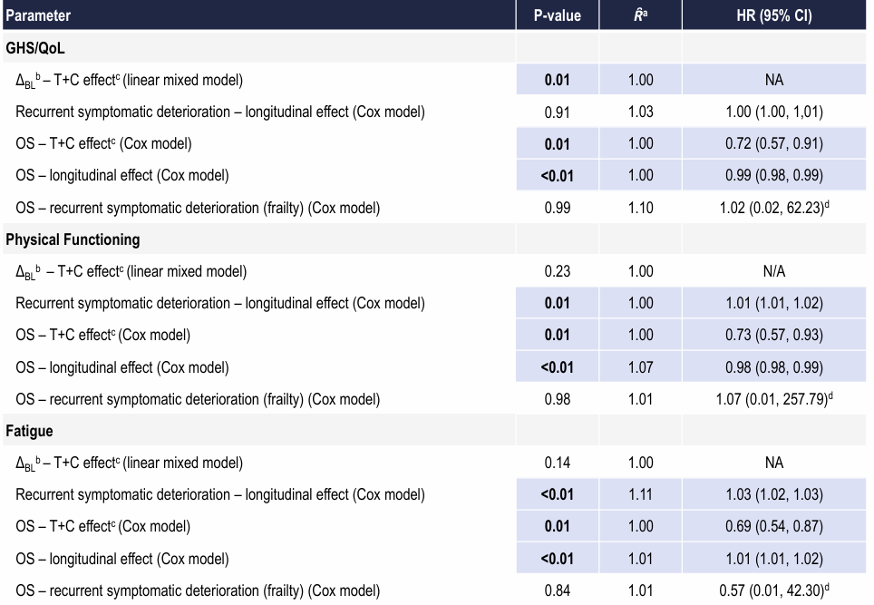 EORTC QLQ-C30评分-联合生存模型结果显示,T+C组相较于P+C组在GHS/QoL上具有显著改善(ΔBL–T+C效应),显著降低了所有PRO领域的OS事件风险(OS–T+C效应),HR范围为0.69–0.73,死亡风险降低27%–31%。GHS/QoL和躯体功能的纵向改善(OS–纵向效应)与死亡风险降低显著相关(HR:0.98-0.99;P=0.01),)。躯体功能下降、疲劳加剧与未来临床恶化事件(RS-D)风险增加显著相关(HR:1.01–1.03;P<0.01);疲劳加剧则与死亡风险增加显著相关(HR:1.01;P<0.01)。