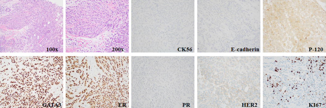 见癌巢浸润,乳腺浸润性小叶癌转移可能性大。IHC:ER约95%中等-强(+)、TRPS1(+)、GATA-3(+)、CK5/6(-)、E-cadherin(-)、CgA(-)、Syn(-)。