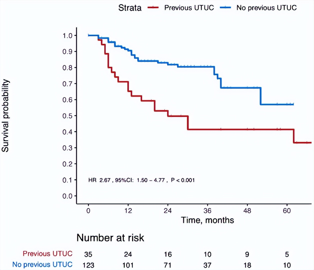 在非匹配分析中,异时性NMIBC与膀胱内高危复发风险增加相关,多变量分析显示,异时性NMIBC亚组复发率为54.3%,而原发NMIBC亚组复发率为28.4%(P=0.012,HR 3.12)。组间复发平均时间相似(异时性NMIBC亚组为11.2个月,原发NMIBC亚组为13.2个月,P=0.548)。除了既往UTUC病史外,多变量分析显示,其他复发高危因素包括EAU风险评分高(P=0.047,HR 2.84)和未能继续维持BCG治疗长达6个月(P=0.009,HR 5.49)。此外,异时性NMIBC亚组中有10例患者(28.6%)最终进展为MIBC,显著高于原发NMIBC亚组,后者仅有7例患者(4.7%)出现疾病进展(P=0.007,HR 4.19)。异时性NMIBC亚组也显示出更高的远处转移进展率(20%vs.6.5%,P=0.017,HR 3.33)。在非倾向匹配分析中,总生存率无显著差异(8.6%vs.18.4%,P=0.248,HR 0.44)。