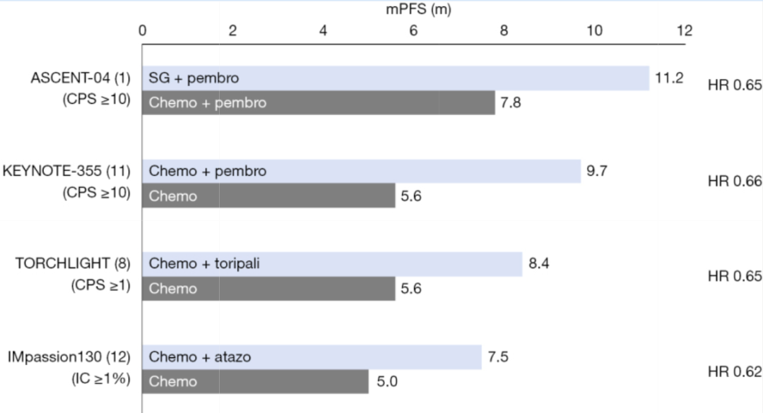 图2.转移性三阴性乳腺癌(mTNBC)一线含免疫治疗的III期试验的PFS