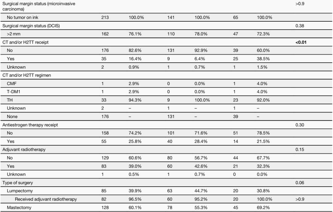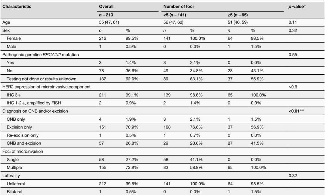 研究者最终纳入213例符合上述标准的乳腺癌患者。诊断时的中位年龄为55岁。212例患者(99.5%)为DCIS-MI,1例(0.5%)为小叶原位癌伴小叶微浸润癌。169例(79.3%)DCIS成分为高级别,伴有中度、中心性或显著坏死。211例患者(99.1%)的微浸润成分HER2 3+,2例(0.9%)为HER2 1-2+并且FISH+。155例患者(72.8%)存在多发性MI灶。85例(39.9%)患者接受了保乳手术,其中82例(96.5%)接受了辅助放疗。128例(60.1%)患者接受了全乳切除术,其中48例(37.5%)接受了对侧乳房切除术。184例(86.4%)患者接受了前哨淋巴结活检。35例(16.4%)患者接受了辅助化疗和/或HER2靶向治疗,主要方案为TH(n=33,94.3%)。52例(24.4%)为ER/PR+微浸润癌,其中40例(76.9%)接受了辅助内分泌治疗。15例(7.0%)患者为ER/PR低阳性(肿瘤细胞的1-10%)微浸润癌,其中4例(26.7%)接受了辅助内分泌治疗。