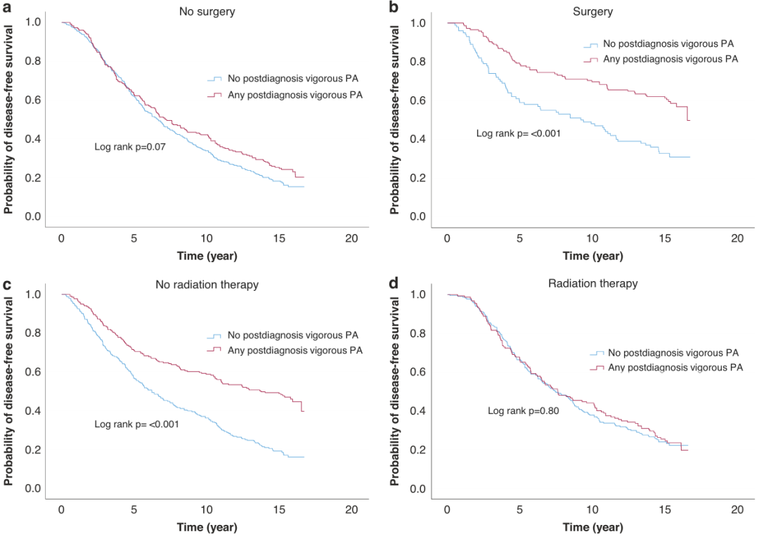 在未接受放射治疗的组中(n=464),与诊断后未进行积极体力活动的患者相比,进行积极体力活动的患者复发、进展、第二癌症或死亡的发生可能性降低了约35%(HR=0.64)。在接受放射治疗的组中(n=366),积极体力活动的无病生存率无统计学显著差异(HR=1.14)。