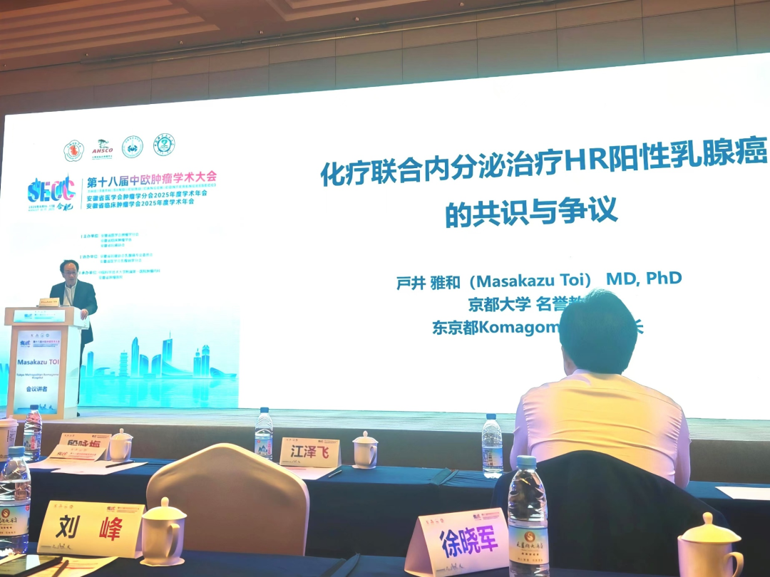 8月16日上午,户井雅和教授应邀来到安徽合肥,参加了“第十八届中欧肿瘤学术大会暨安徽省医学会肿瘤学分会2025年度学术年会、安徽省临床肿瘤学会2025年度学术年会”。会议主席为中国医学科学院肿瘤医院徐兵河教授、解放军总医院江泽飞教授和中国科学技术大学附属第一医院(安徽省立医院)刘连新教授,执行主席为中国科学技术大学附属第一医院(安徽省立医院)潘跃银教授和中国科学技术大学附属第一医院(安徽省立医院)韩兴华教授。会上,户井雅和教授进行了题为《化疗联合内分泌治疗乳腺癌的共识和争议》的主题演讲,详细阐释了化疗联合内分泌治疗的积极作用和负面效应,并分享了日本在化疗联合内分泌治疗方面的应用经验。