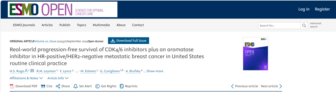 RUGO H S,LAYMAN R M,LYNCE F,et al.Real-world progression-free survival of CDK4/6 inhibitors plus an aromatase inhibitor in HR-positive/HER2-negative metastatic breast cancer in United States routine clinical practice[J].ESMO Open,2025,10(9):105570.