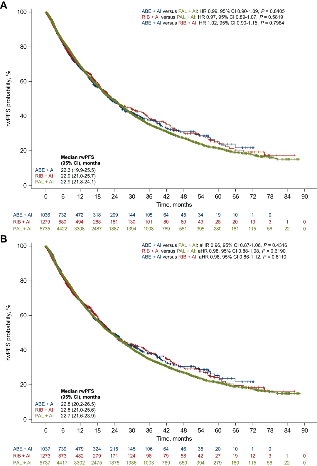在主要疗效终点rwPFS方面,经sIPTW后哌柏西利+AI组的中位rwPFS为22.7个月,瑞波西利+AI组均为22.9个月,阿贝西利+AI组为22.9个月;其中,瑞波西利+AI组与哌柏西利+AI组相比的HR为0.97(95%CI 0.88–1.07,P=0.5755),阿贝西利+AI组与哌柏西利+AI组相比的HR为0.96(95%CI 0.86–1.06,P=0.3889),阿贝西利+AI组与瑞波西利+AI组相比的HR为0.98(95%CI 0.86–1.12,P=0.8024),表明组间rwPFS均无显著差异(图3)。另外,亚组分析与敏感性分析结果均与总体队列一致,未发现显著组间差异(图4)。