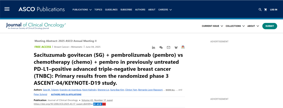 [12]Sara M.Tolaney,et al.Sacituzumab govitecan(SG)+pembrolizumab(pembro)vs chemotherapy(chemo)+pembro in previously untreated PD-L1–positive advanced triple-negative breast cancer(TNBC):Primary results from the randomized phase 3 ASCENT-04/KEYNOTE-D19 study.2025 ASCO LBA 109.
