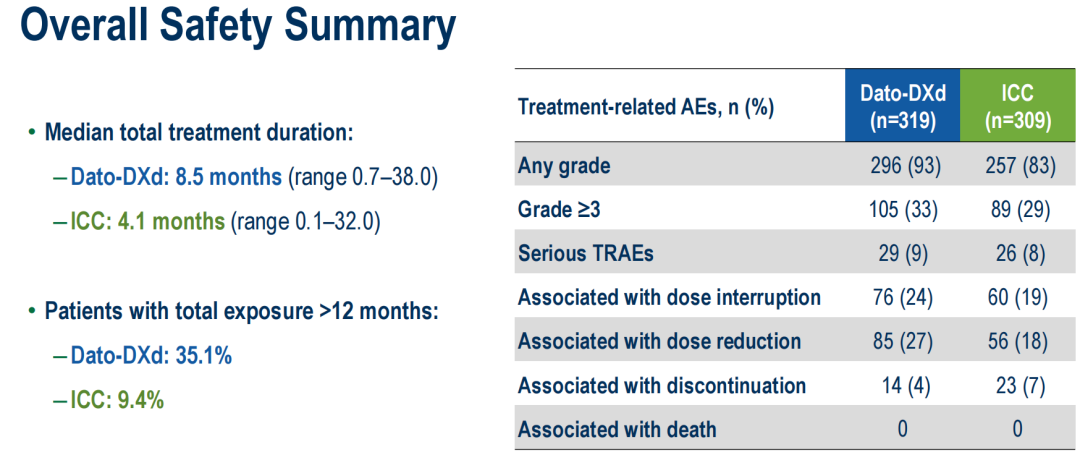 在治疗持续时间两倍于化疗(8.5 vs 4.1个月)的情况下,Dato-DXd组导致停药的治疗相关不良事件(TRAEs)反而低于化疗组(4%vs 7%),≥3级的TRAEs(33%vs 29%)和严重不良事件(sTRAE:9%vs 8%)则与化疗组相当。