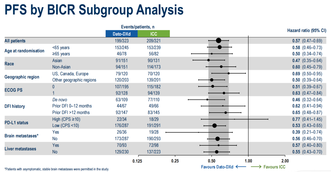 研究共入组了644例患者,Dato-DXd组323例,对照组化疗组321例。入组患者中,有几个重要的基线特征值得特别关注。首先,亚洲患者占比达到了44%,非常契合亚洲人群的临床治疗需求;另一项ASCENT-03研究中,亚洲患者占比约为23%。再者,TB-02研究没有限定早期治疗DFI时间,即纳入了DFI<6个月(15%)的快速进展人群,以及有接近10%的患者为PD-L1阳性(CPS≥10),将对临床治疗带来更多启发;ASCENT-03研究要求入组患者DFI≥6个月,入组的PD-L1阳性患者不足1%。此外,TB-02研究入组患者包含高比例的内脏转移或脑转移患者,分别高达75%和10%,ASCENT-03研究中脑转移患者比例约为5%。这两个研究都关注了脑转移这类难治性的患者。