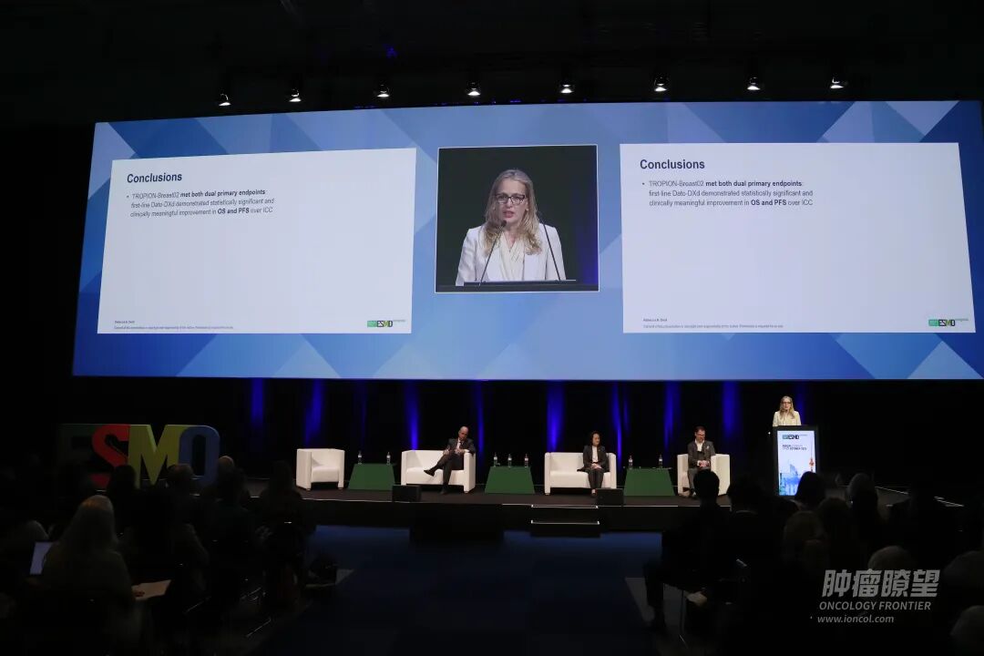 编者按:三阴性乳腺癌(TNBC),一个经常令患者闻之色变、使医生束手无策的高度恶性肿瘤,亟需更多新型治疗方案以提升疗效、延长患者生存期。在当前的晚期一线治疗中,仍有将近七成的转移性TNBC(mTNBC)不适合免疫治疗,仅靠毒性大、疗效有限的化疗难以阻挡肿瘤进展的速度。在2025年ESMO大会上,全球肿瘤学家的目光聚焦于TROPION-Breast02等重磅研究,见证Trop2抗体偶联药物(ADC)即将改变一线治疗格局,尤其是德达博妥单抗(Datopotamab deruxtecan,Dato-DXd)成为首个mTNBC一线治疗获得PFS和OS双阳性结果的新型ADC。江苏省人民医院黄香教授和上海交通大学医学院附属仁济医院殷文瑾教授,在亲历ESMO重磅研究报告后,在大会现场第一时间接受《肿瘤瞭望》的邀请,对Trop2 ADC用于不适合免疫治疗的mTNBC患者一线治疗的研究进展进行深入解读。