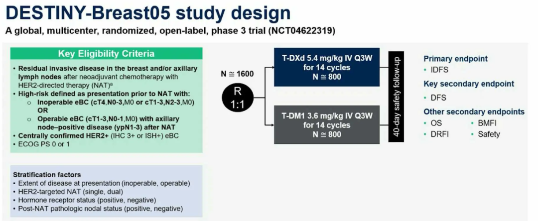 罗婷教授:以第1号重磅研究摘要(LBA1)亮相ESMO年会的DESTINY-Breast05研究,是一项全球性、多中心、开放标签、III期临床试验,纳入新辅助治疗后的non-pCRHER2阳性乳腺癌患者,研究设置的入组标准为:①新辅助前不可手术早期乳腺癌:cT4,N0-3,M0或cT1-3,N2-3,M0;②新辅助前可手术早期乳腺癌:cT1-3,N0-1,M0,且新辅助治疗后腋窝淋巴结阳性(ypN1-3)。研究共入组1635例患者,按1:1分组后予T-DXd或T-DM1辅助治疗,主要终点为无浸润性疾病生存期(IDFS),关键次要终点为无病生存期(DFS),总生存期(OS)等为次要终点。