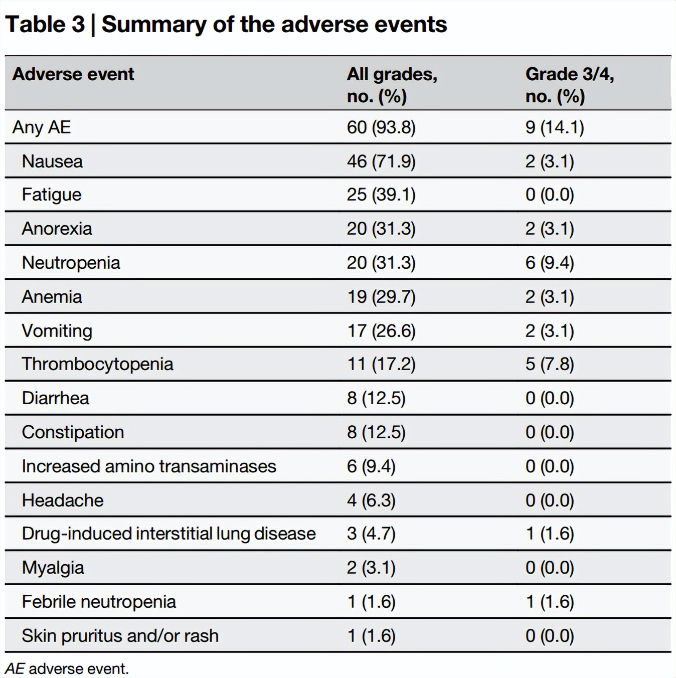 93.8%的患者经历了至少一种AEs,最常见的为恶心(71.9%)、乏力(39.1%)、食欲减退(31.3%)和中性粒细胞减少(31.3%);3级或4级不良反应主要为中性粒细胞减少(9.4%)、血小板减少(7.8%)和恶心(3.1%)。间质性肺病(ILD)的发生率为4.7%,其中1例为3级ILD,并需住院治疗。部分患者(10.9%)因血小板减少、呕吐或中性粒细胞减少而调整剂量。