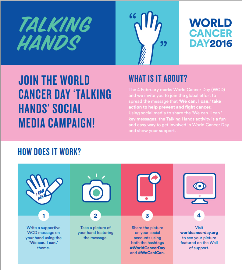 为了增加“世界癌症日”的影响力和传播力,2月4日当天,Twitter、Facebook和Instagram几大平台将同时开展“Talking hands”社交媒体活动,号召人们在社交账号上传照片,支持“抗癌”事业!