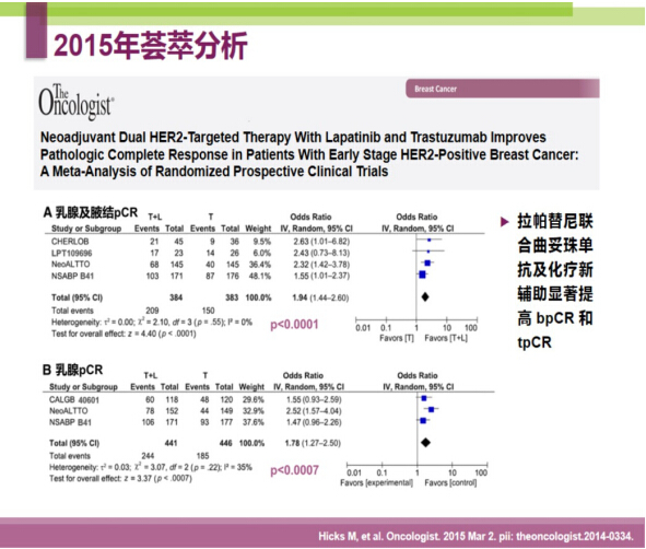 那么,这两个靶向药物联合化疗,是否能真正提高患者的pCR?哪些患者对这样的双靶方案更为敏感?首先是发表在2015年发表在The Oncologist杂志的荟萃分析,该分析涵盖了其中的6项研究。虽然入选的这6项研究有乳腺pCR作为研究终点,也有以乳腺及腋窝pCR作为研究终点。综合分析后发现,曲妥珠单抗联合拉帕替尼联合化疗更为有效(图2)。同时,根据受体状态分析发现,对于HR-/HER2+患者,双靶治疗能够更好地提高pCR率。