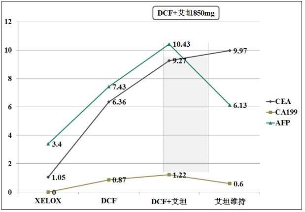 虽然该患者肿瘤的影像学变化不大,但肿瘤标志物均有所下降。总体疗效评估为SD。目前仍在阿帕替尼850mg口服维持中,化疗反应可耐受,日常生活不受影响。经过治疗,患者体重较6个月前增加了4kg。